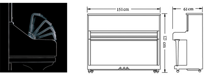 云杉木制成的坚固音板、碾压而成的云杉木背柱、真空处理的钢板、键盘盖带缓降系统、德国顶级榔头